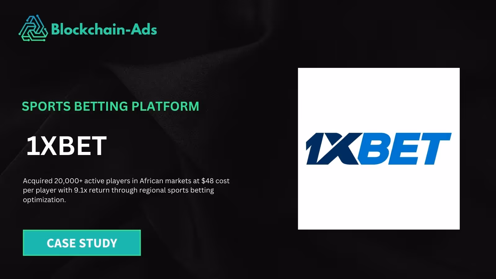 1xBet acquired 20,000 active players in African markets at $48 cost per acquisition with a 9.1x return through regional sports betting targeting.