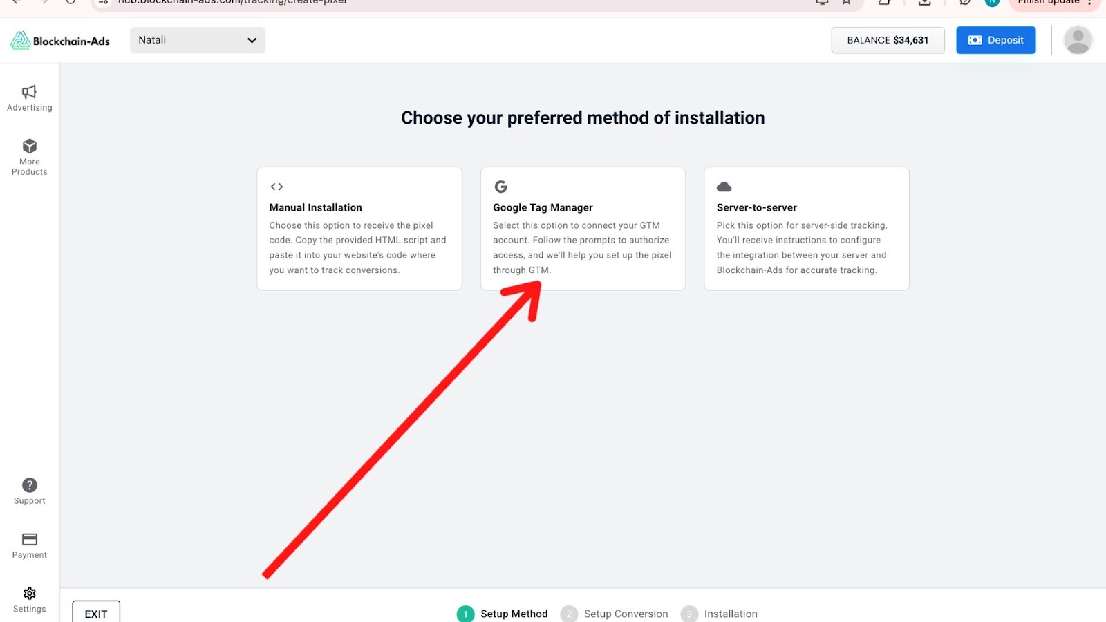 Gehen Sie zum HUB und starten Sie den Tracking-Einrichtungsprozess.