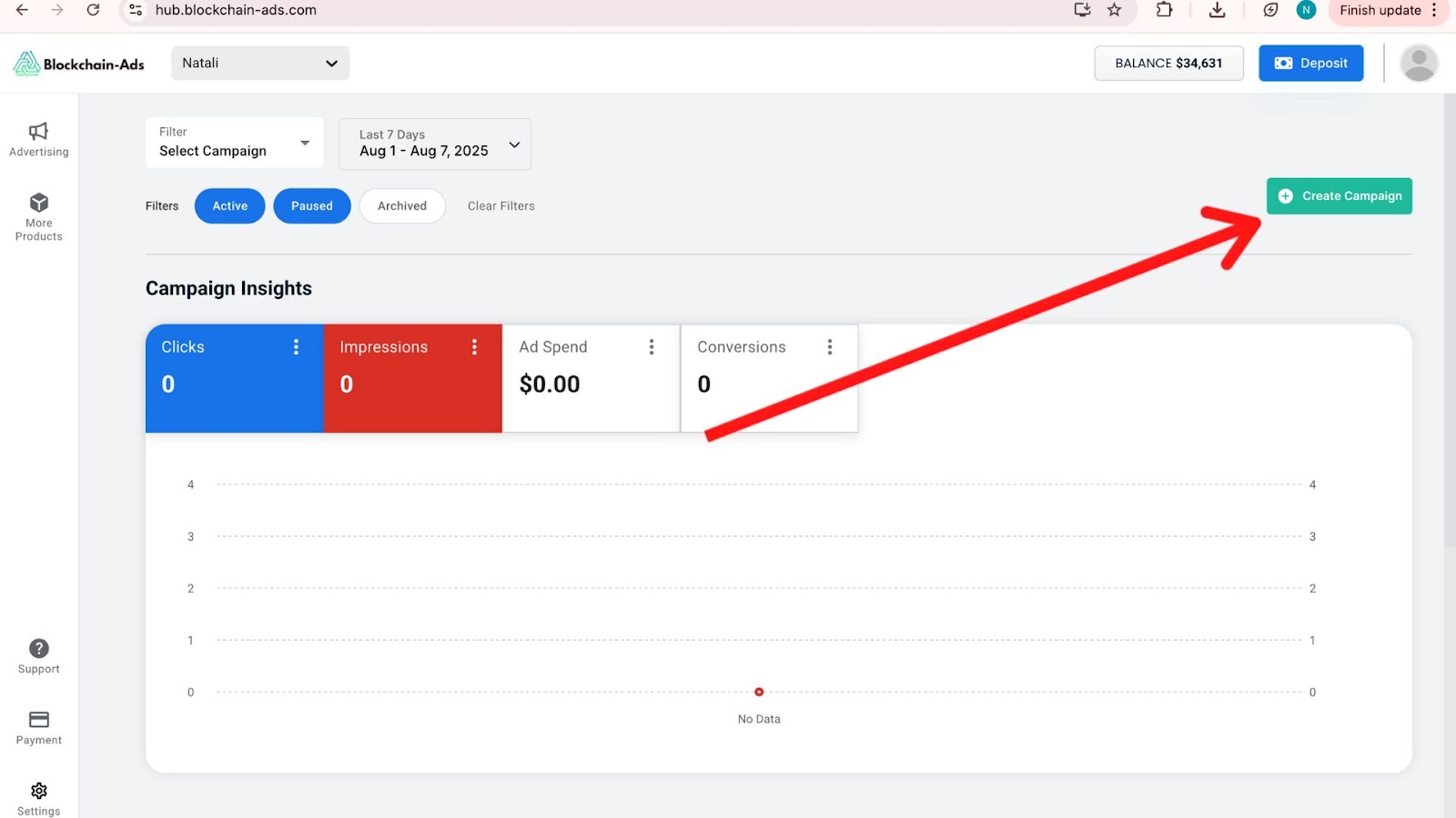 Le lancement d'une nouvelle campagne sur Blockchain-Ads est simple avec le tableau de bord HUB. Ce guide vous accompagne étape par étape pour mettre votre campagne en ligne avec succès.