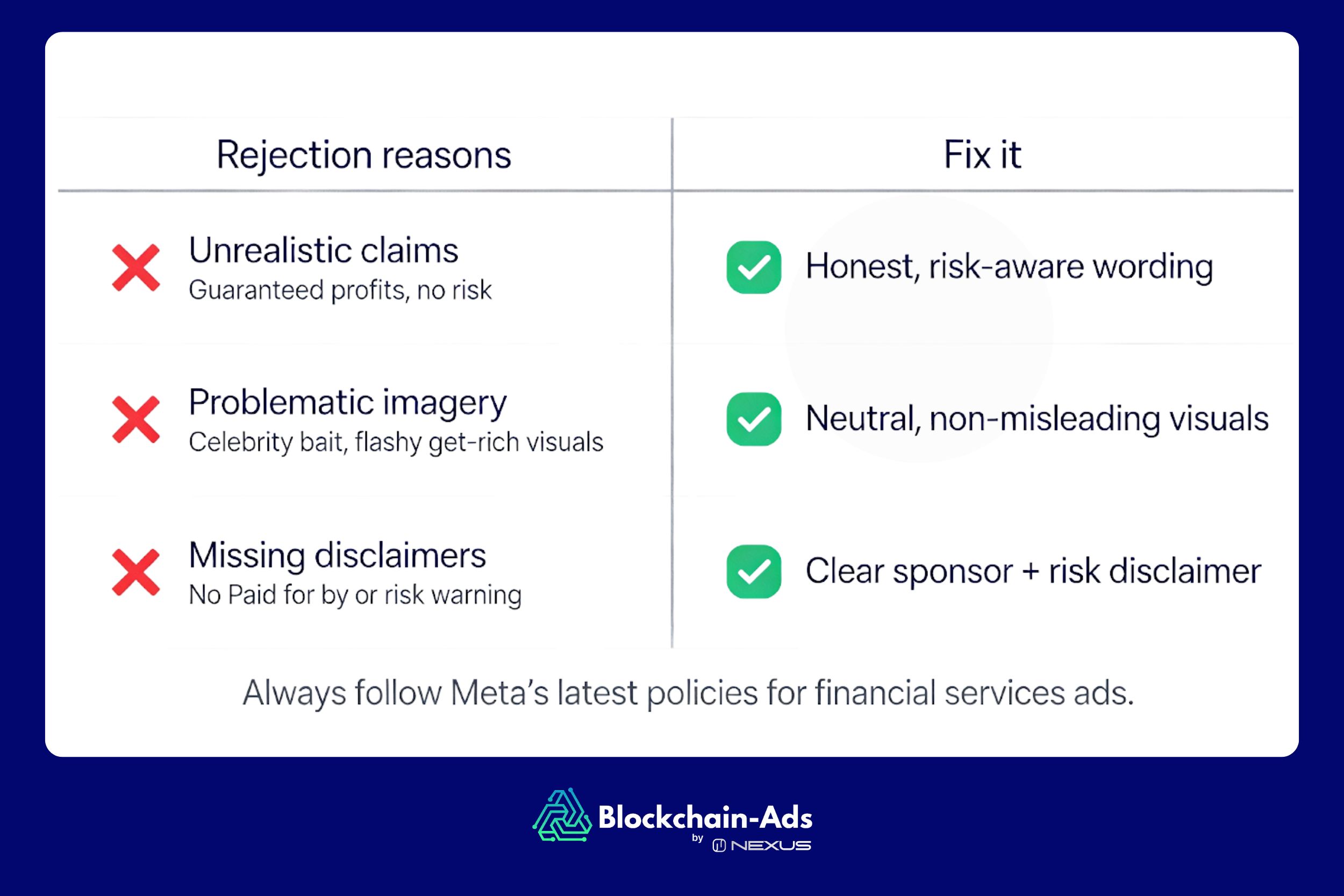 Meta는 2024년 10월에 미국, 캐나다 및 유럽 일부 지역의 금융 브랜드를 위한 금융 상품 및 서비스 광고 카테고리를 도입했습니다. 이는 이러한 지역의 외환 플랫폼이 캠페인으로 타겟팅하고 도달할 수 있는 대상을 크게 제한합니다. 이러한 타겟팅 제한과 함께 비주얼, 면책 조항 및 메시징에 대한 빈번한 광고 거부로 인해 대부분의 광고주는 이제 Blockchain-Ads와 같은 대체 플랫폼을 활용하고 있습니다.