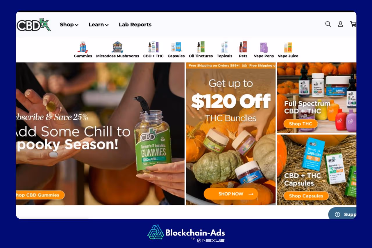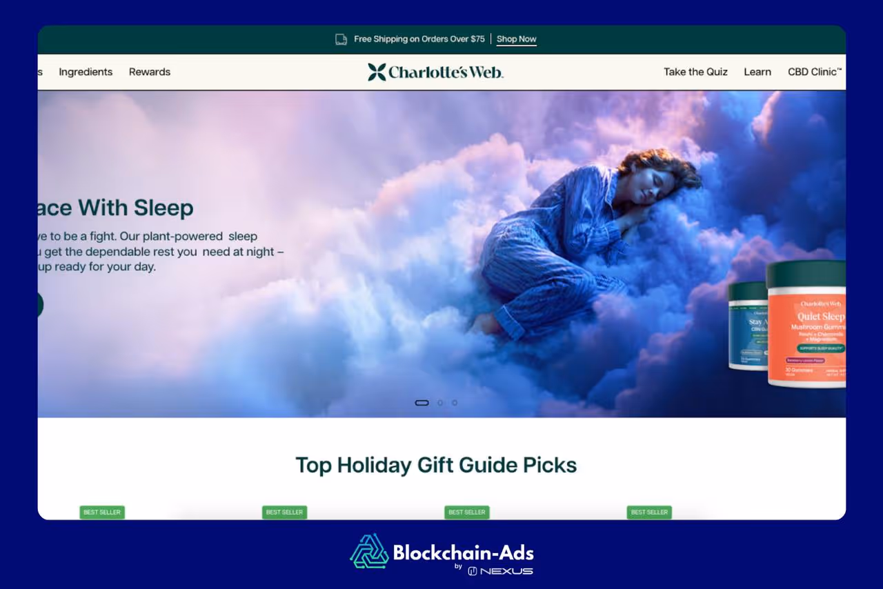 Running CBD ads on Google or Meta is still difficult, so many brands move their main budget to programmatic platforms built for regulated products, like Blockchain-Ads.