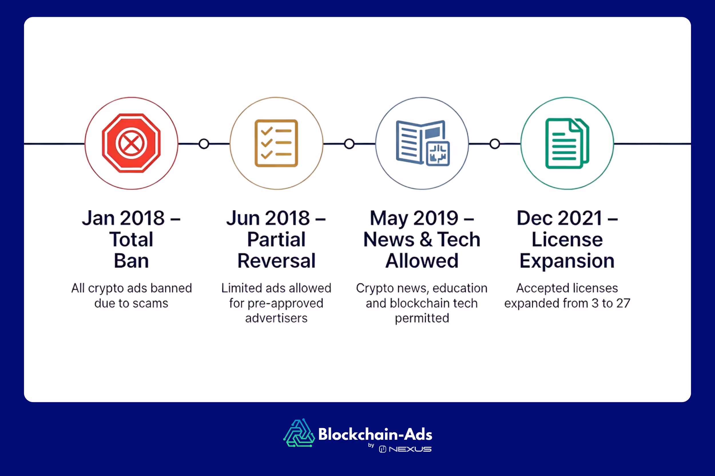 The current policy structure is the result of over 5 years of regulatory refinement. In January 2018, Facebook enacted a total ban on all cryptocurrency-related ads. This was in response to a flood of fraudulent ICOs AND crypto scams.