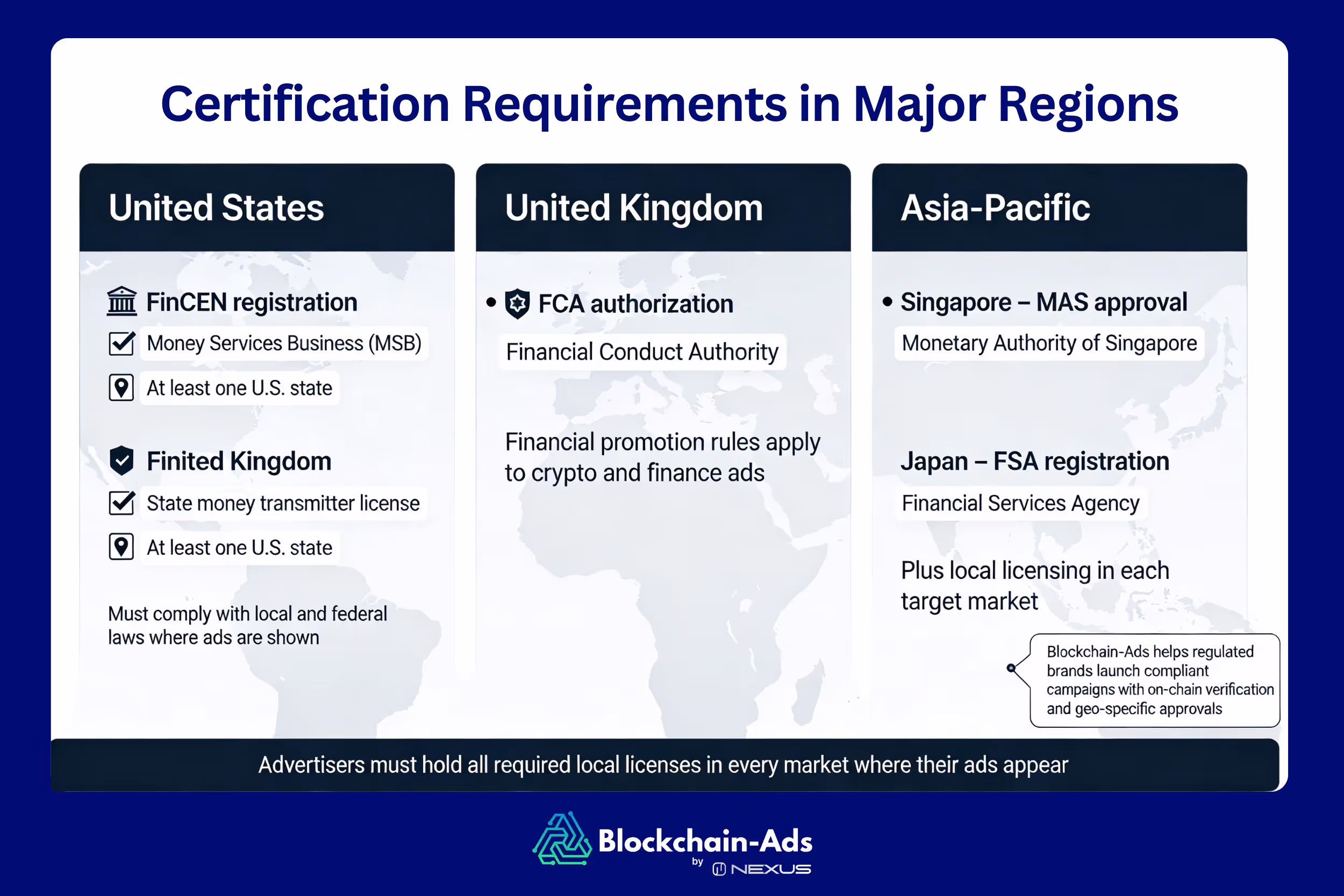 Meanwhile, the licensing for global advertisers varies by country. You need approval from a local financial authority like the Financial Conduct Authority (FCA) in the U.K. or a similar body in Singapore, Japan or any other country.