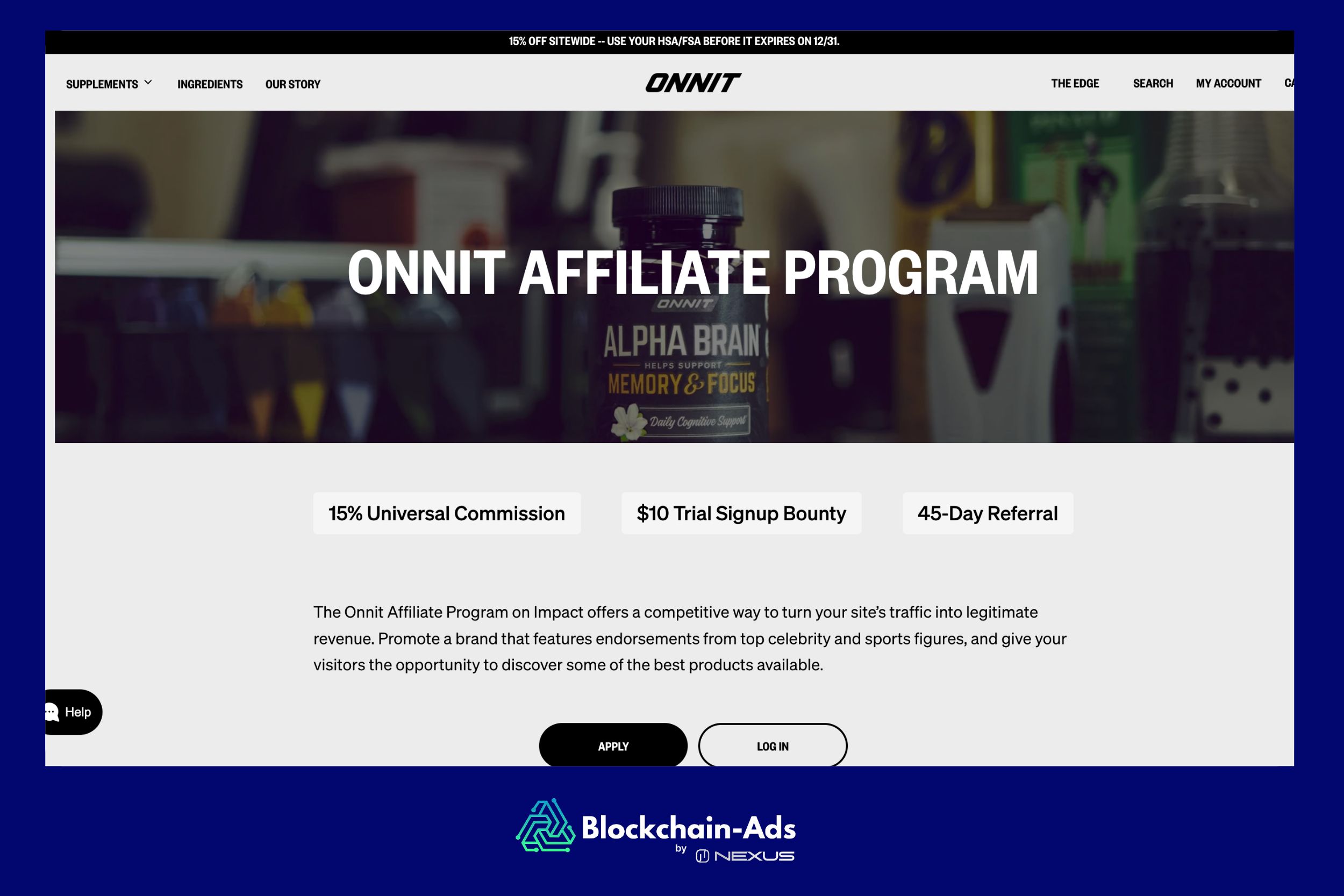 Onnit will pay you 15% universal commission on all sales you make. You receive a 10% trial signup bounty. There is also a 45-day referral period during which you must convince your referrals to purchase through your links.