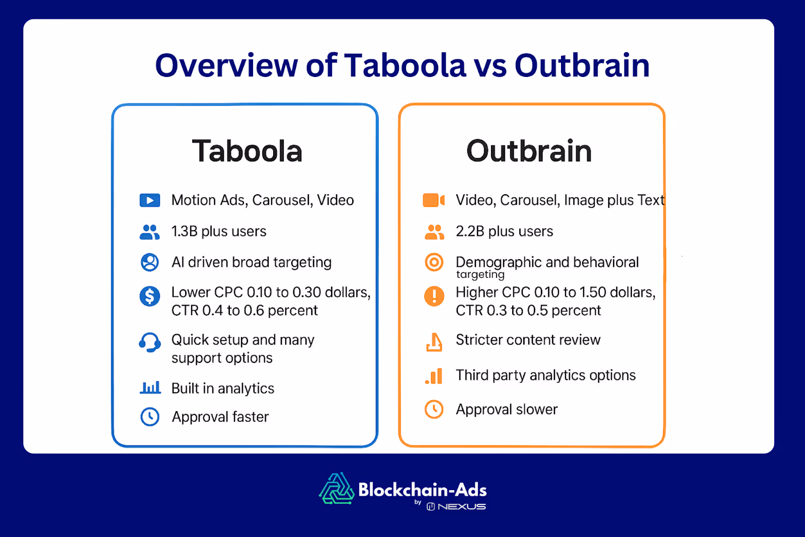 There’s no one-size-fits-all platform. Your choice depends on your goals, industry, and budget. Blockchain-Ads, Taboola and Outbrain deliver native ads at scale but target different advertiser needs.